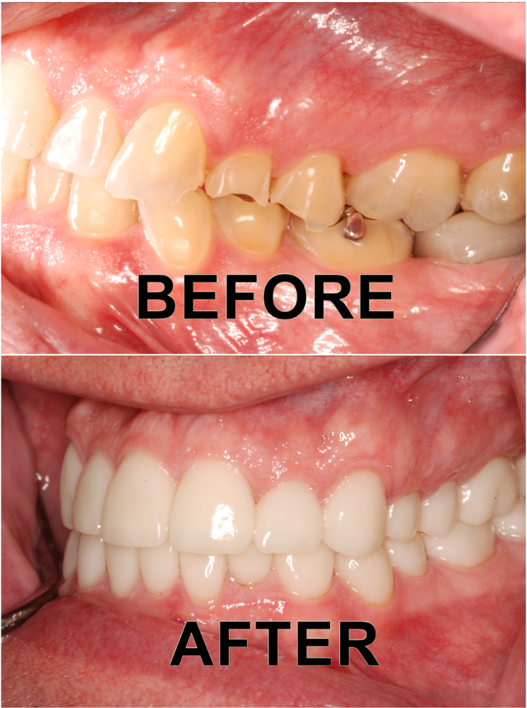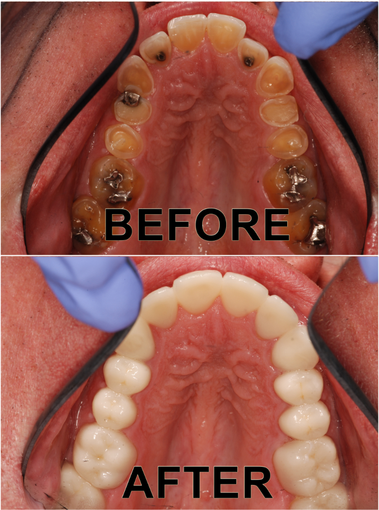 Full mouth restored with all porcelain crowns due to heavy wear from grinding and GERD.