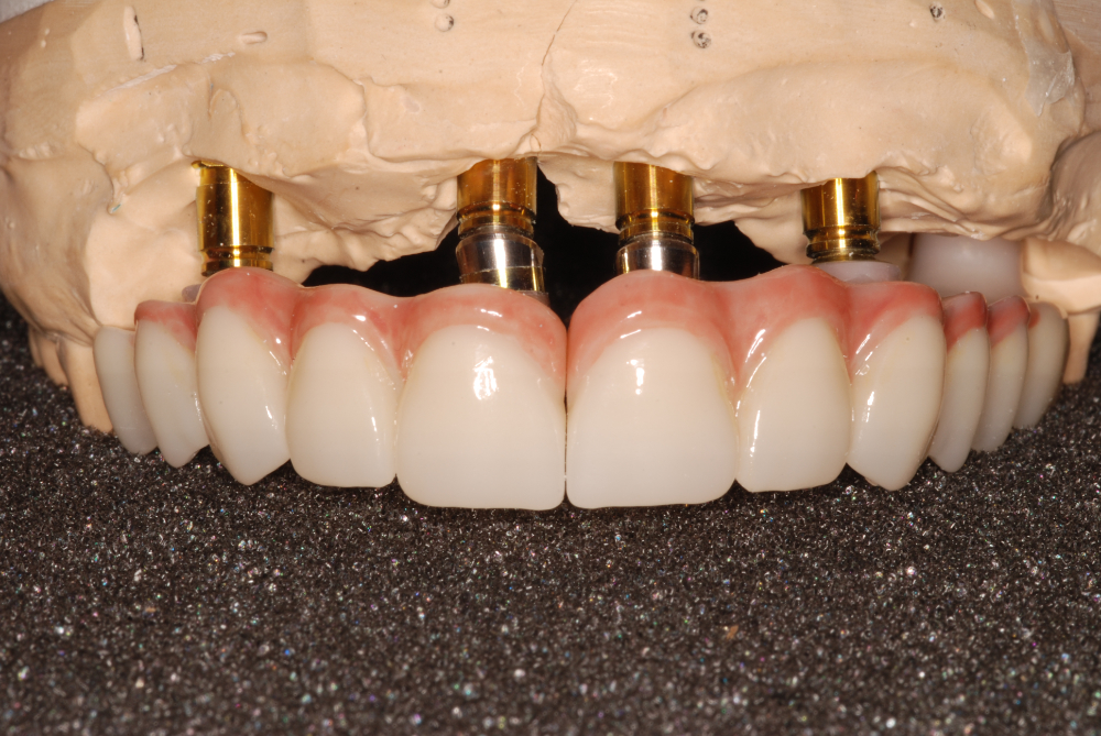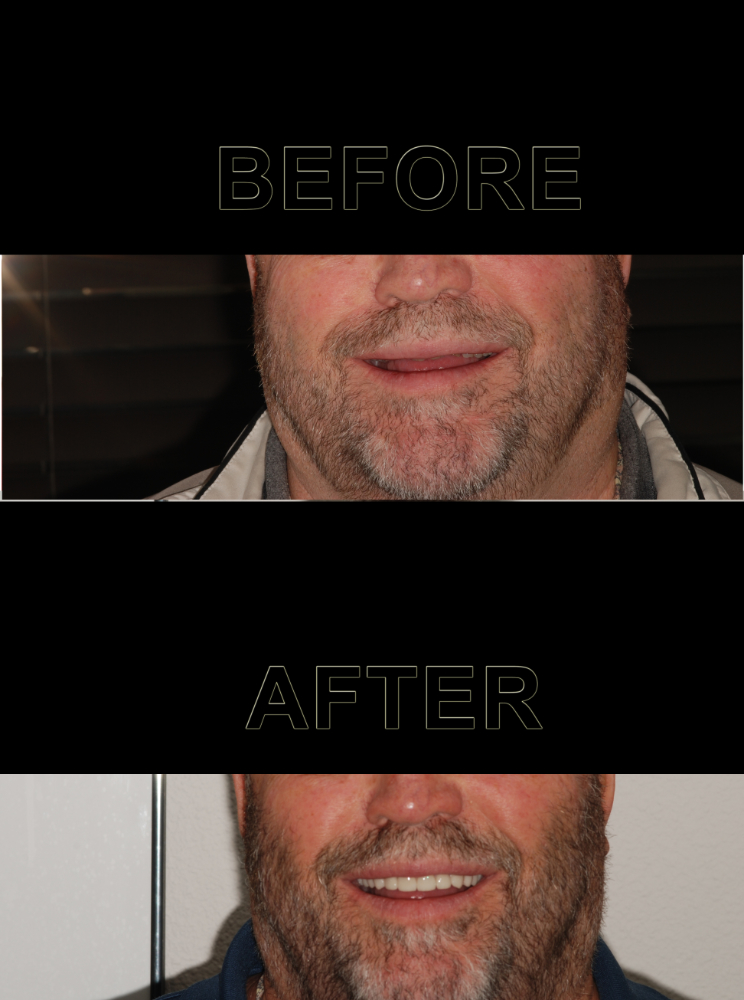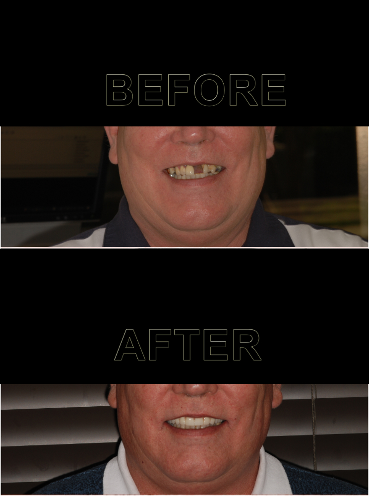 Several extractions due to decay and periodontal disease. 5 implants placed. An implant supported prosthesis.