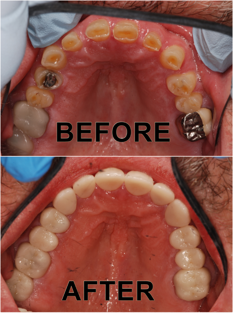 Full mouth restored with all porcelain crowns due to GERD and grinding caused by sleep apnea.
